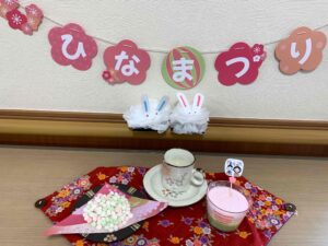 おやつに邪気払いのための甘酒と口腔機能に合わせて、ひなあられや3色ムースをいただいて「桃の節句」をお祝いしました♪